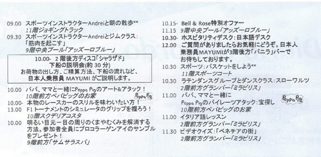 翌日の寄港地情報、レストランの営業時間、ドレスコード、アクティビティなどが分刻みで書かれています。